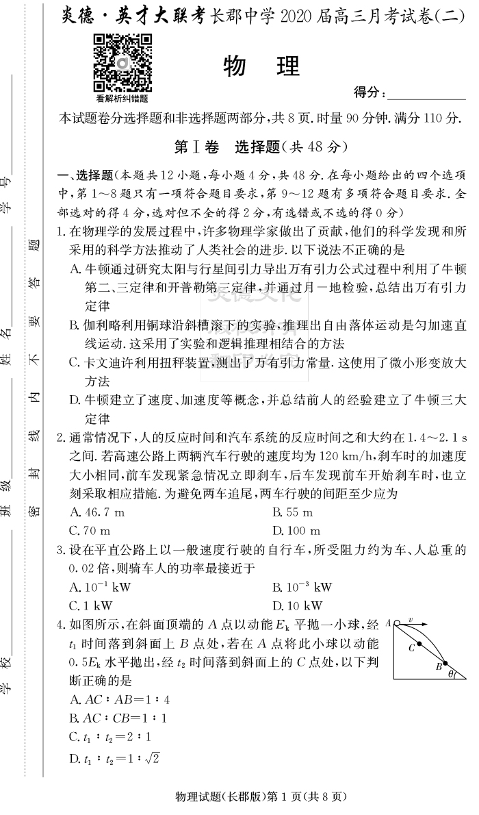 【物理】炎德英才大聯(lián)考2020屆長(zhǎng)郡中學(xué)高三2次月考