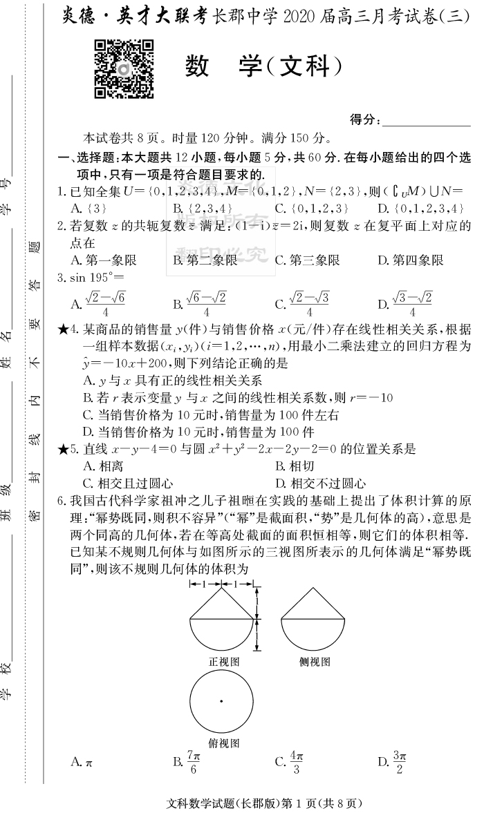 【文數(shù)】炎德英才大聯(lián)考2020屆長郡中學(xué)高三3次月考
