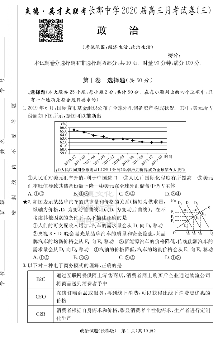 【政治】炎德英才大聯(lián)考2020屆長郡中學(xué)高三3次月考