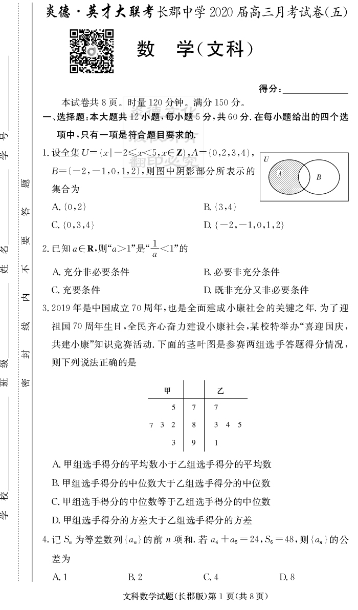 【文數(shù)】炎德英才大聯(lián)考2020屆長郡中學高三5次月考