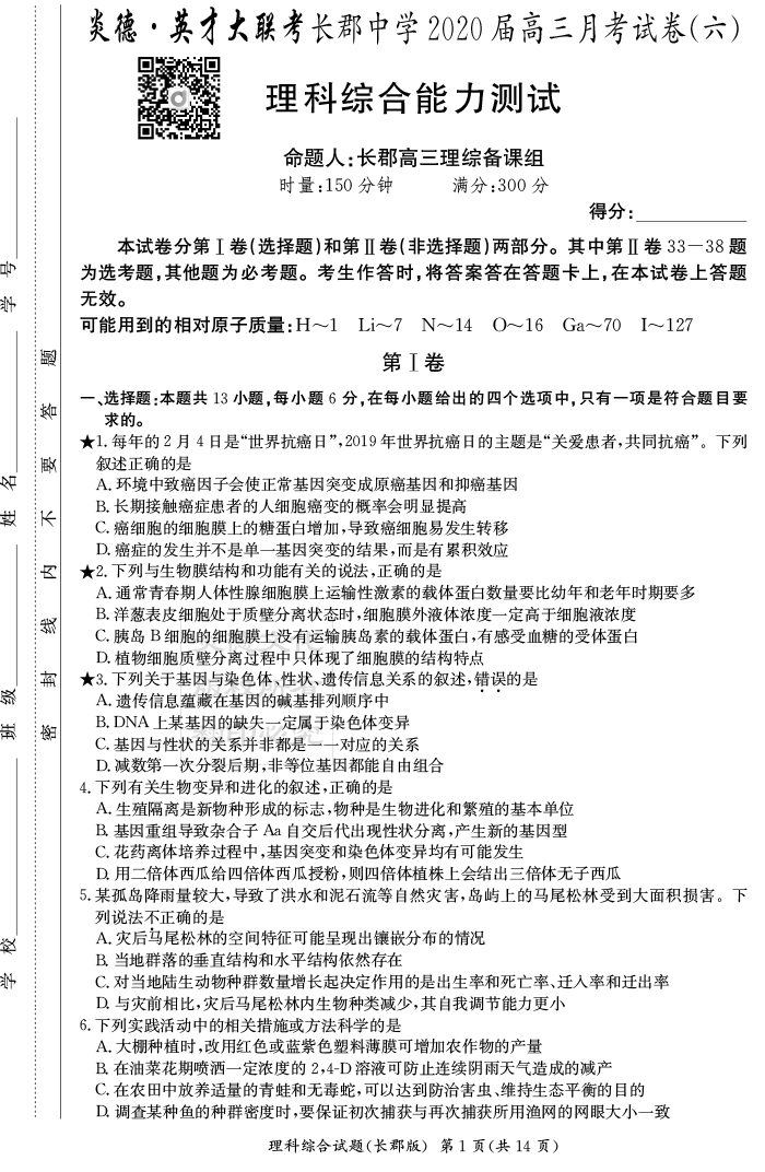 【理綜】炎德英才大聯(lián)考2020屆長郡中學高三6次月考