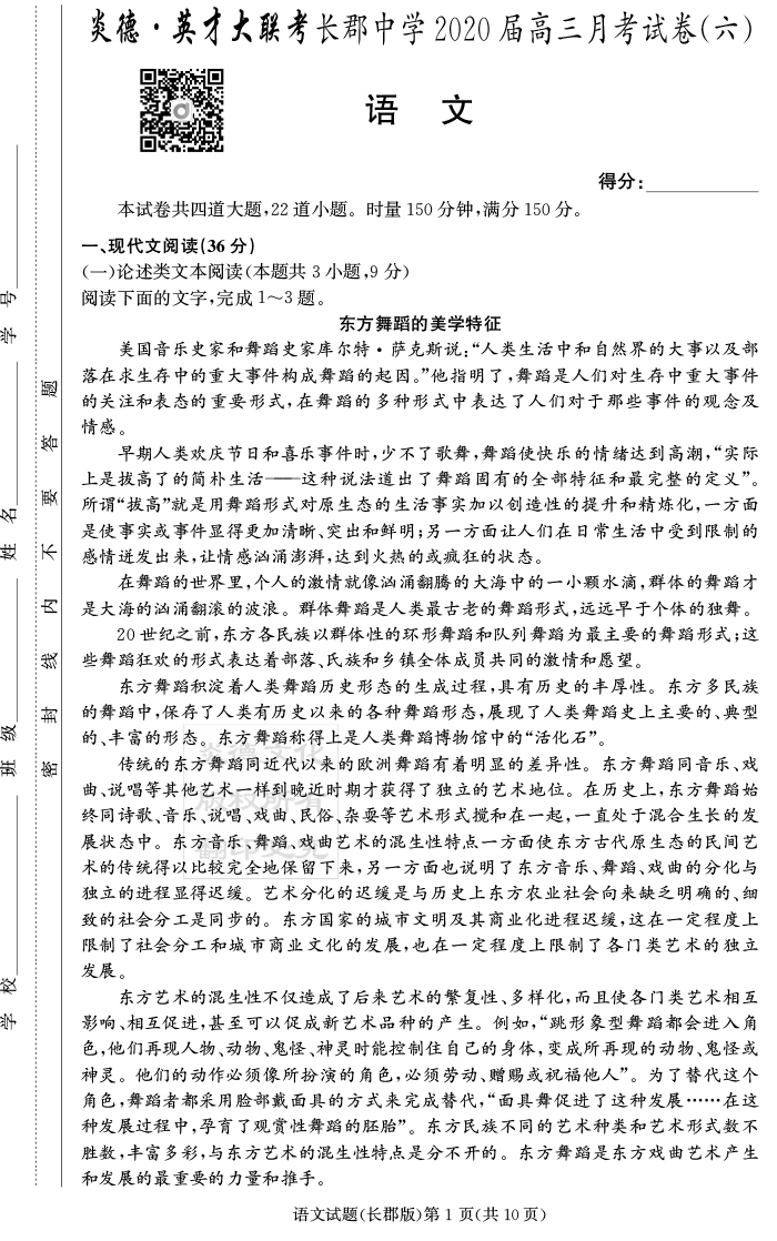 【語文】炎德英才大聯(lián)考2020屆長郡中學(xué)高三6次月考