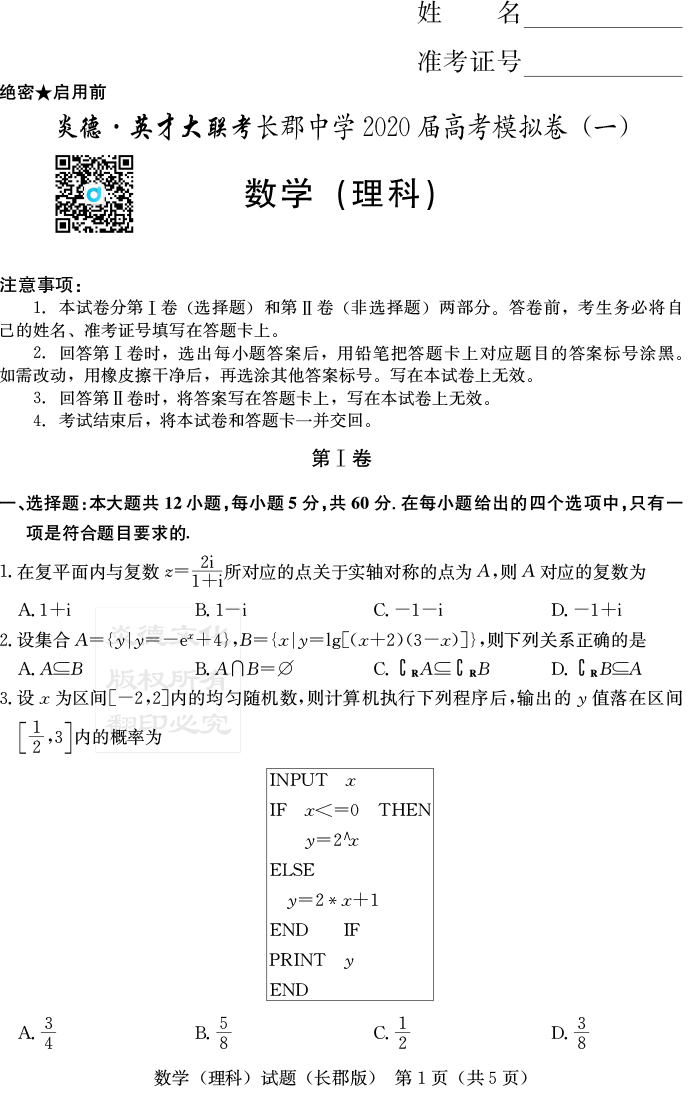 【理數(shù)】炎德英才大聯(lián)考2020屆長(zhǎng)郡中學(xué)高三9次月考(模擬一)