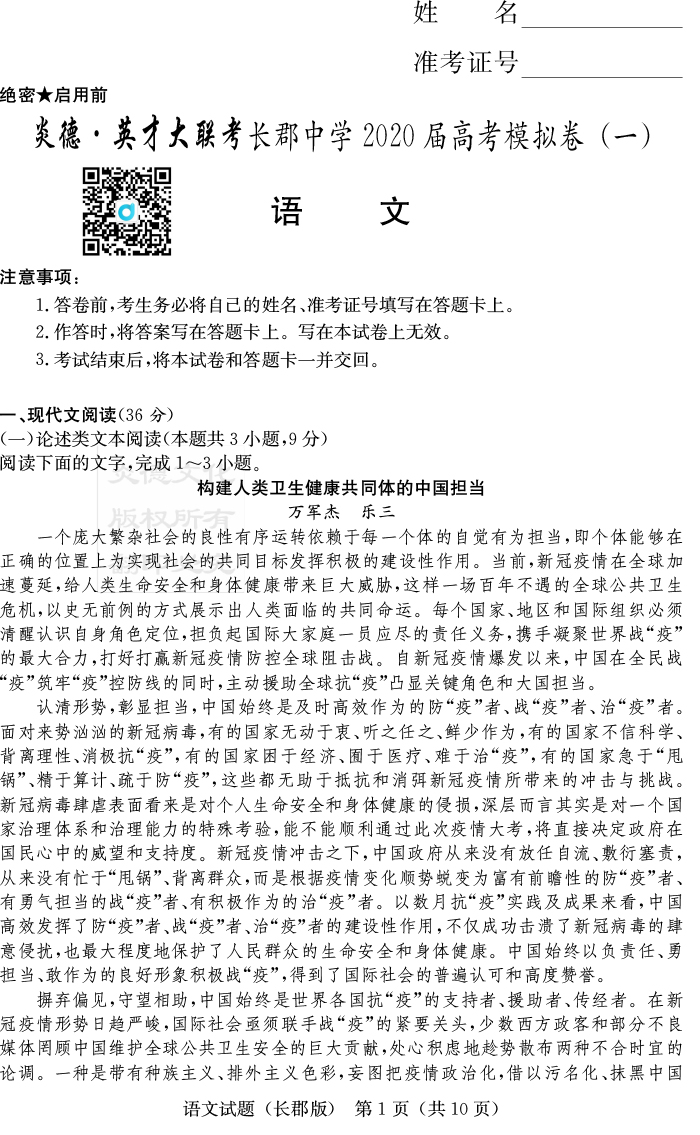 【語(yǔ)文】炎德英才大聯(lián)考2020屆長(zhǎng)郡中學(xué)高三9次月考(模擬一)