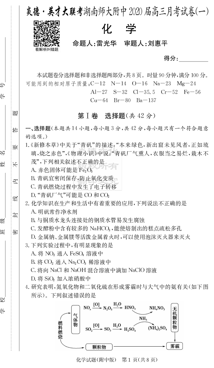 【化學(xué)】炎德英才大聯(lián)考2020屆師大附中高三1次月考
