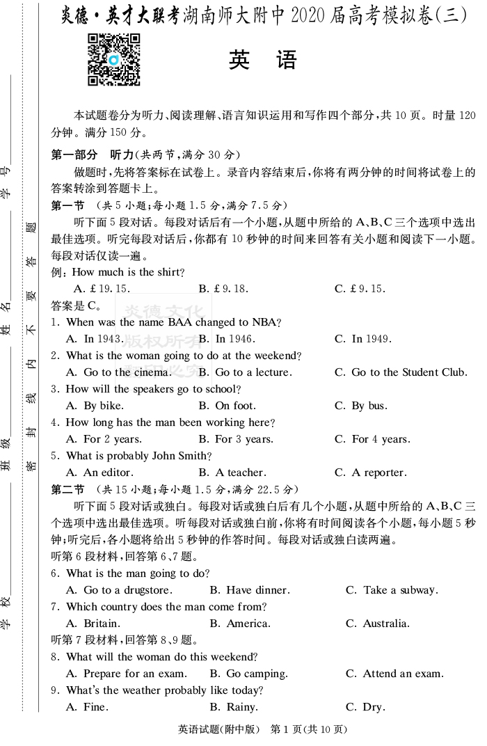 【英語】炎德英才大聯(lián)考2020屆師大附中高三10次月考(模擬三)