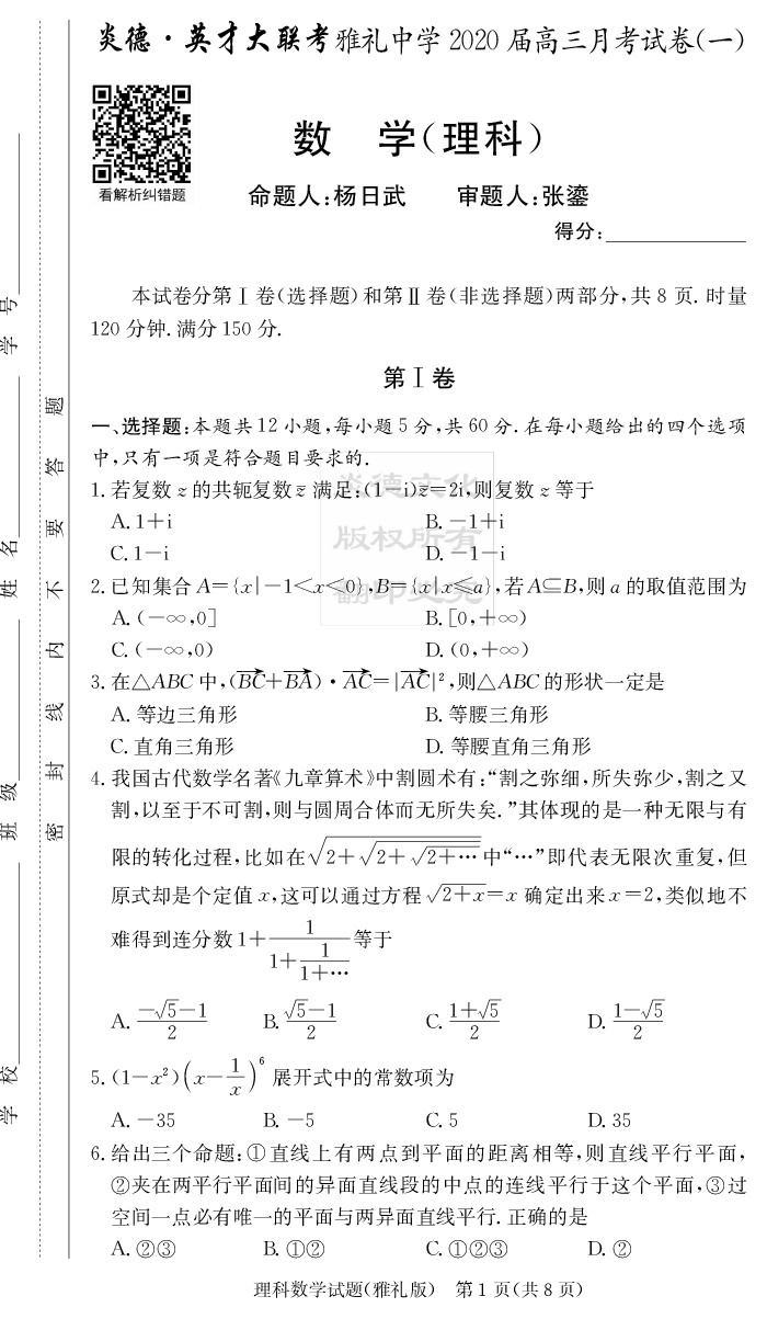 【理數(shù)】炎德英才大聯(lián)考2020屆雅禮中學(xué)高三1次月考