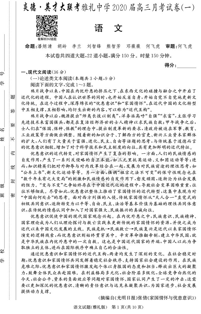 【語文】炎德英才大聯(lián)考2020屆雅禮中學(xué)高三1次月考