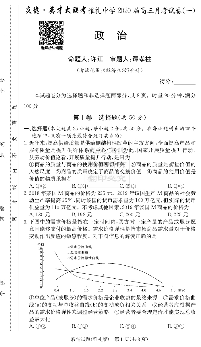 【政治】炎德英才大聯(lián)考2020屆雅禮中學(xué)高三1次月考
