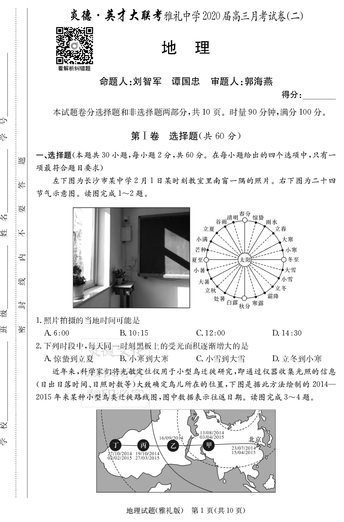 【地理】炎德英才大聯(lián)考2020屆雅禮中學(xué)高三2次月考