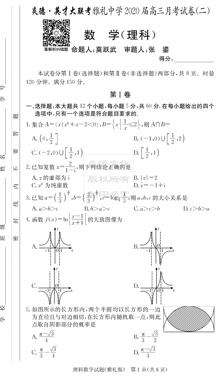 【理數(shù)】炎德英才大聯(lián)考2020屆雅禮中學(xué)高三2次月考