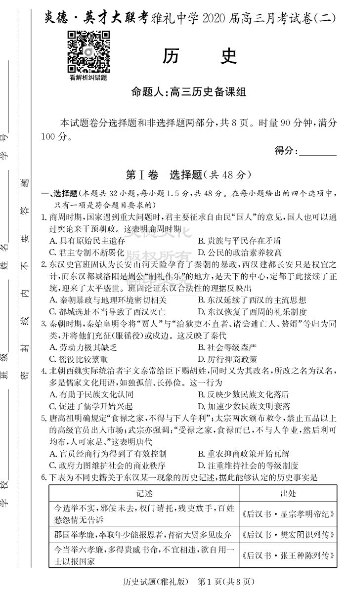 【歷史】炎德英才大聯(lián)考2020屆雅禮中學(xué)高三2次月考