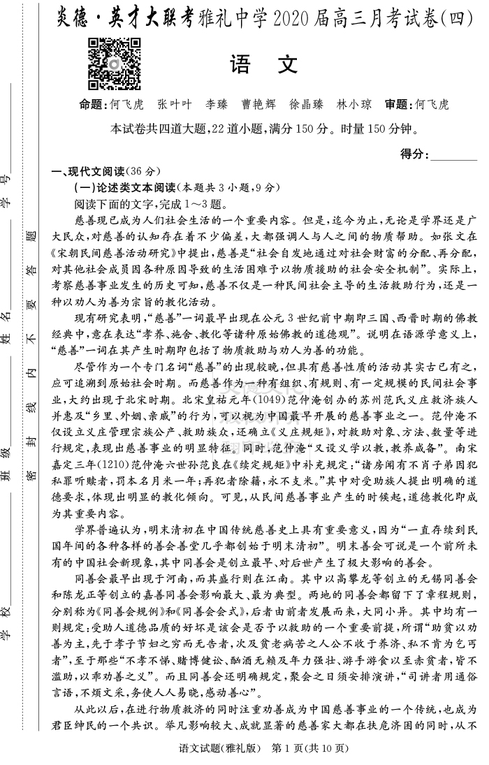 【語文】炎德英才大聯(lián)考2020屆雅禮中學(xué)高三4次月考