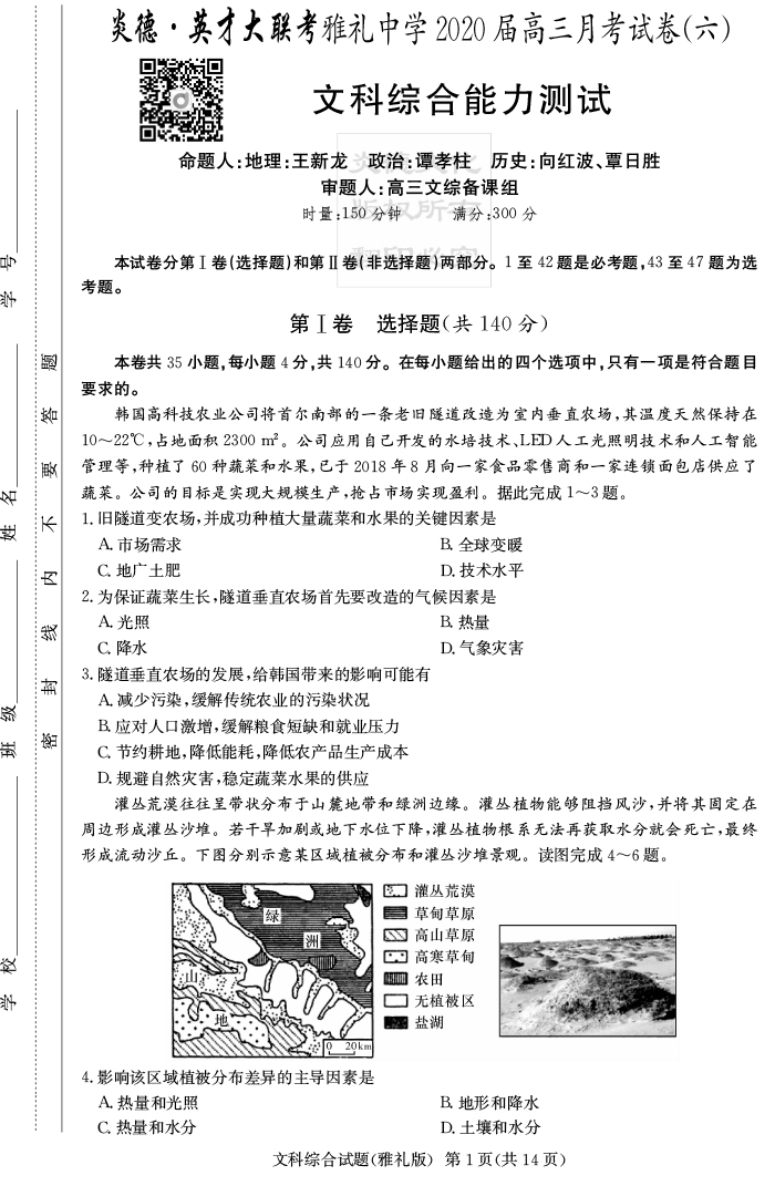 【文綜】炎德英才大聯(lián)考2020屆雅禮中學(xué)高三6次月考
