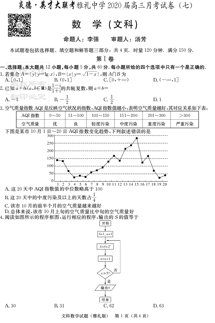 【文數】炎德英才大聯考2020屆雅禮中學高三7次月考