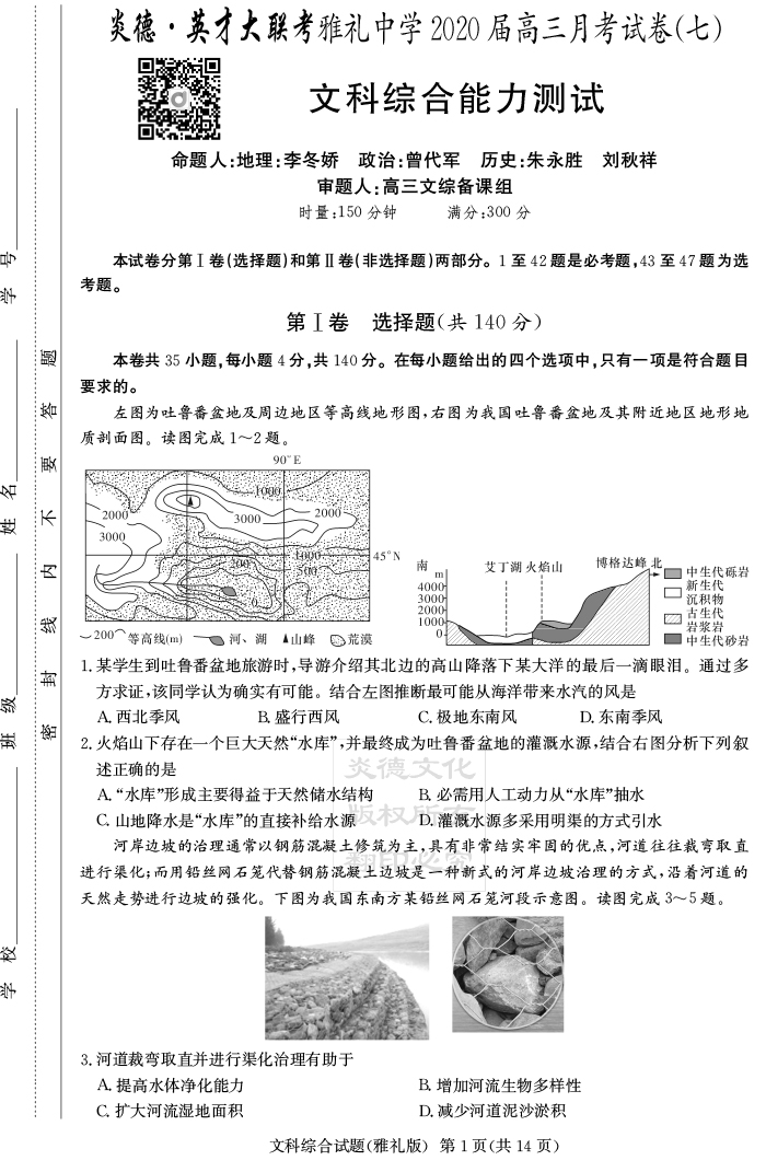 【文綜】炎德英才大聯(lián)考2020屆雅禮中學(xué)高三7次月考