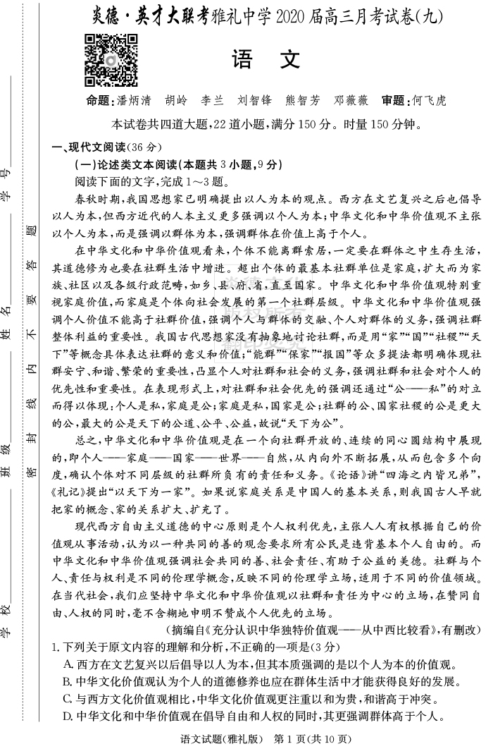 【語(yǔ)文】炎德英才大聯(lián)考2020屆雅禮中學(xué)高三9次月考