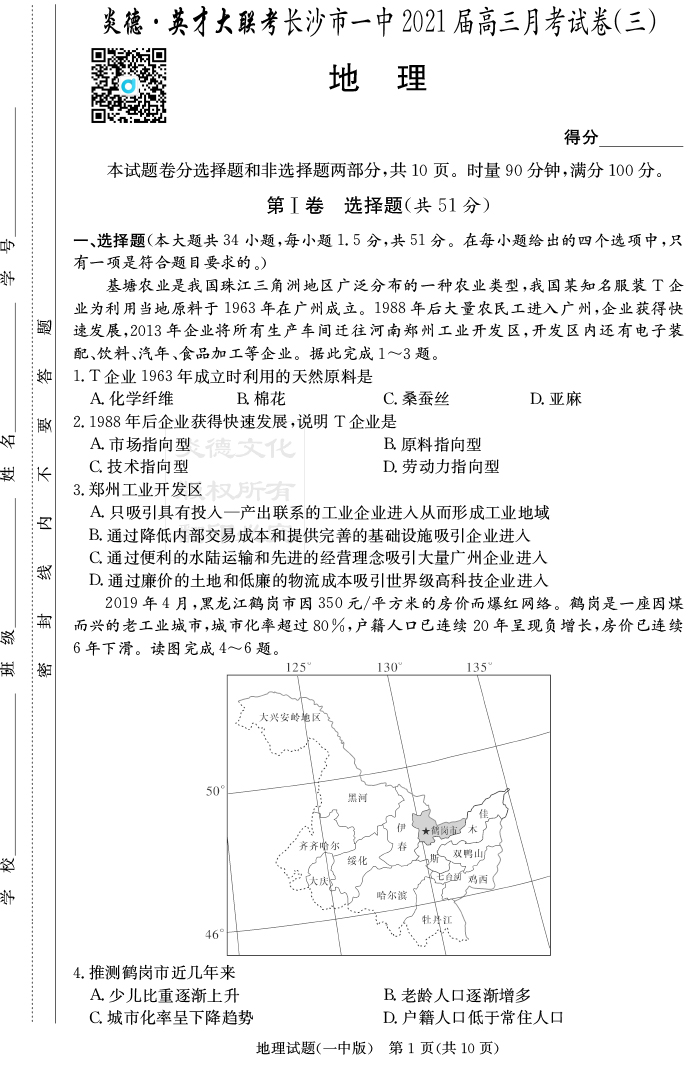 【地理】炎德英才大聯(lián)考2021屆長沙市一中高三3次月考