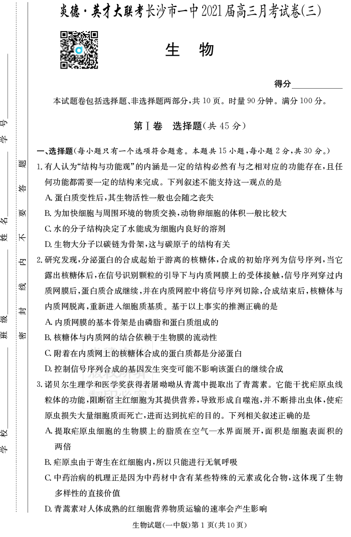 【生物】炎德英才大聯(lián)考2021屆長沙市一中高三3次月考