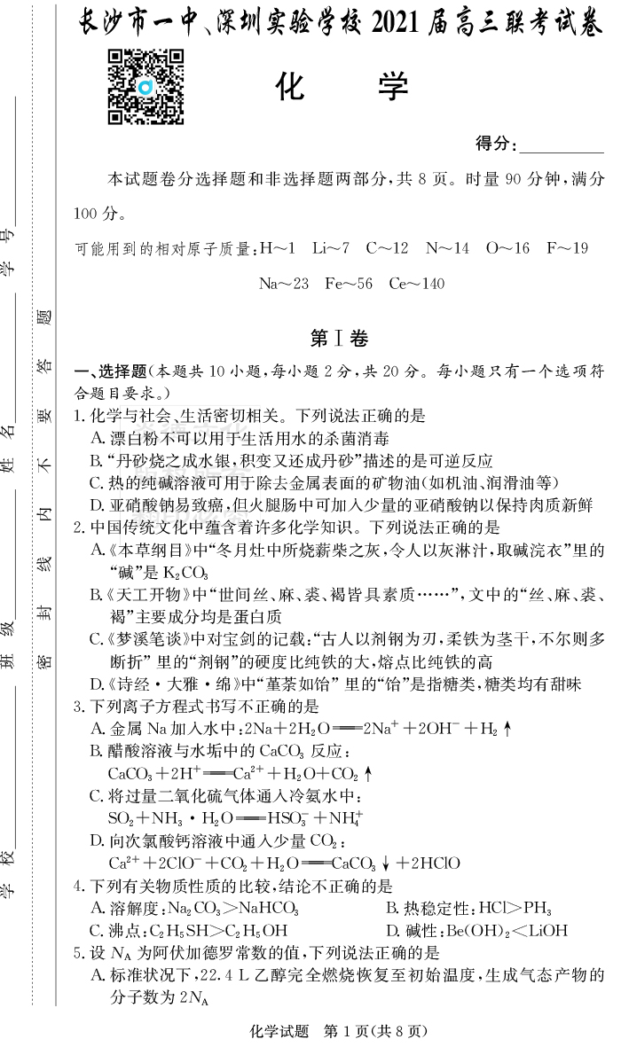 【化學(xué)】炎德英才大聯(lián)考2021屆長沙市一中高三4次月考