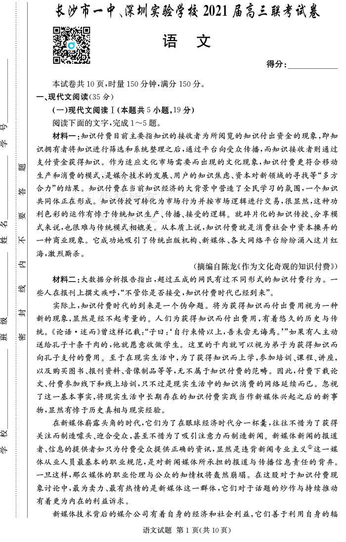 【語文】炎德英才大聯(lián)考2021屆長沙市一中高三4次月考