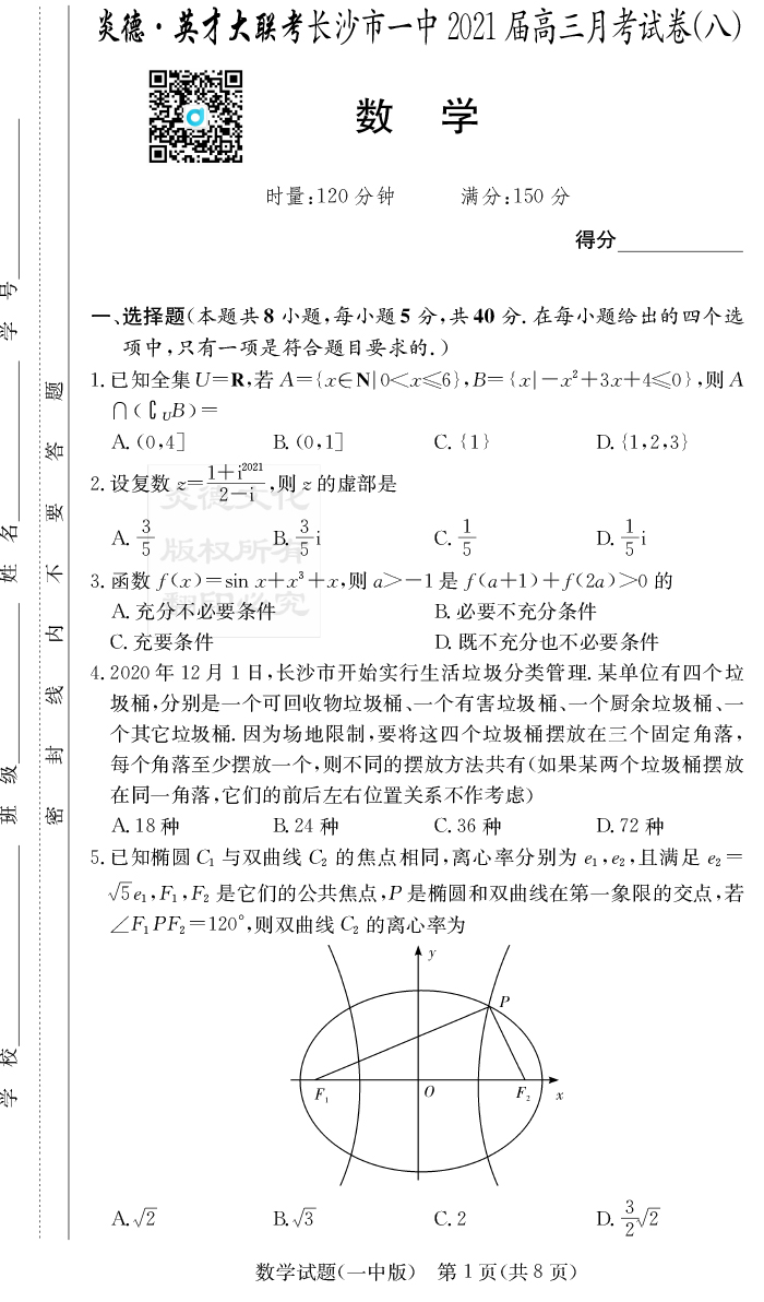 【數(shù)學(xué)】炎德英才大聯(lián)考2021屆長(zhǎng)沙市一中高三8次月考