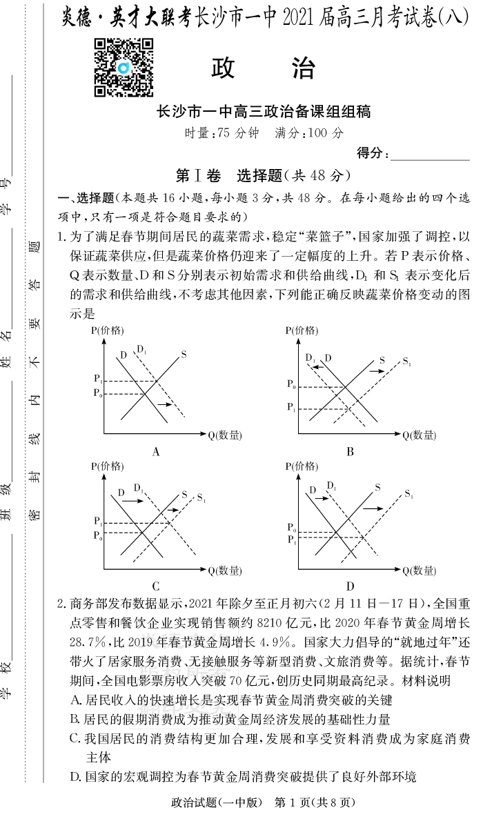 【政治】炎德英才大聯(lián)考2021屆長沙市一中高三8次月考