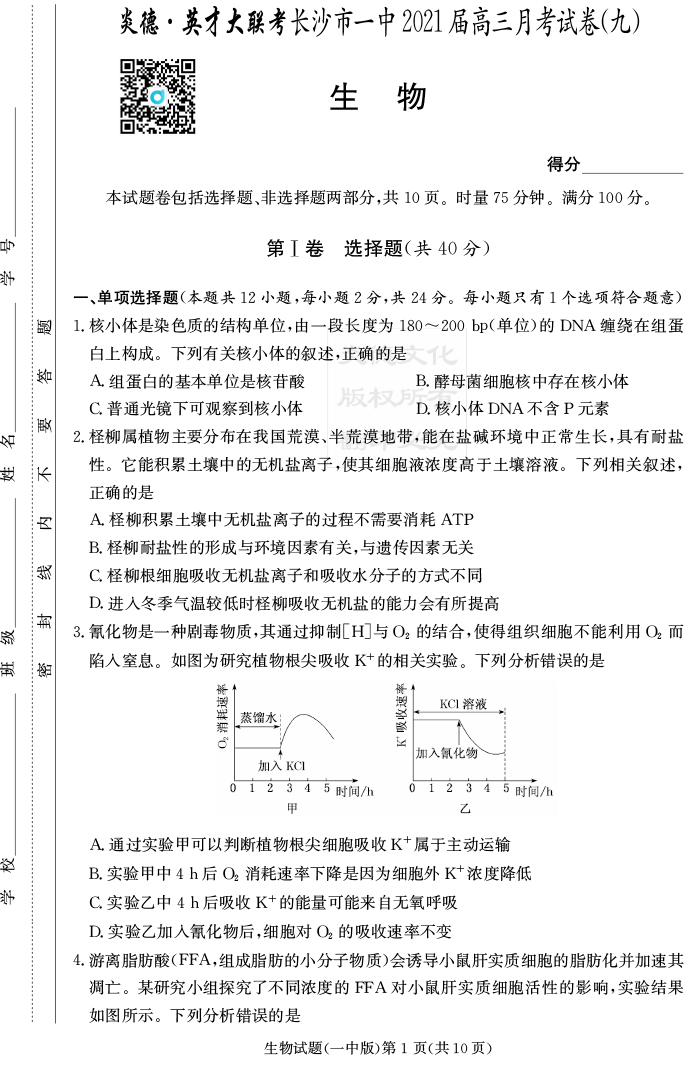 【生物】炎德英才大聯(lián)考2021屆長沙市一中高三9次月考
