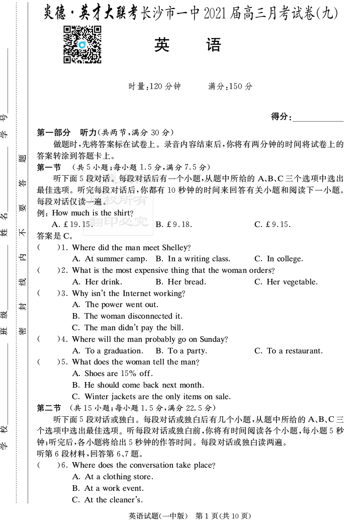 【英語(yǔ)】炎德英才大聯(lián)考2021屆長(zhǎng)沙市一中高三9次月考