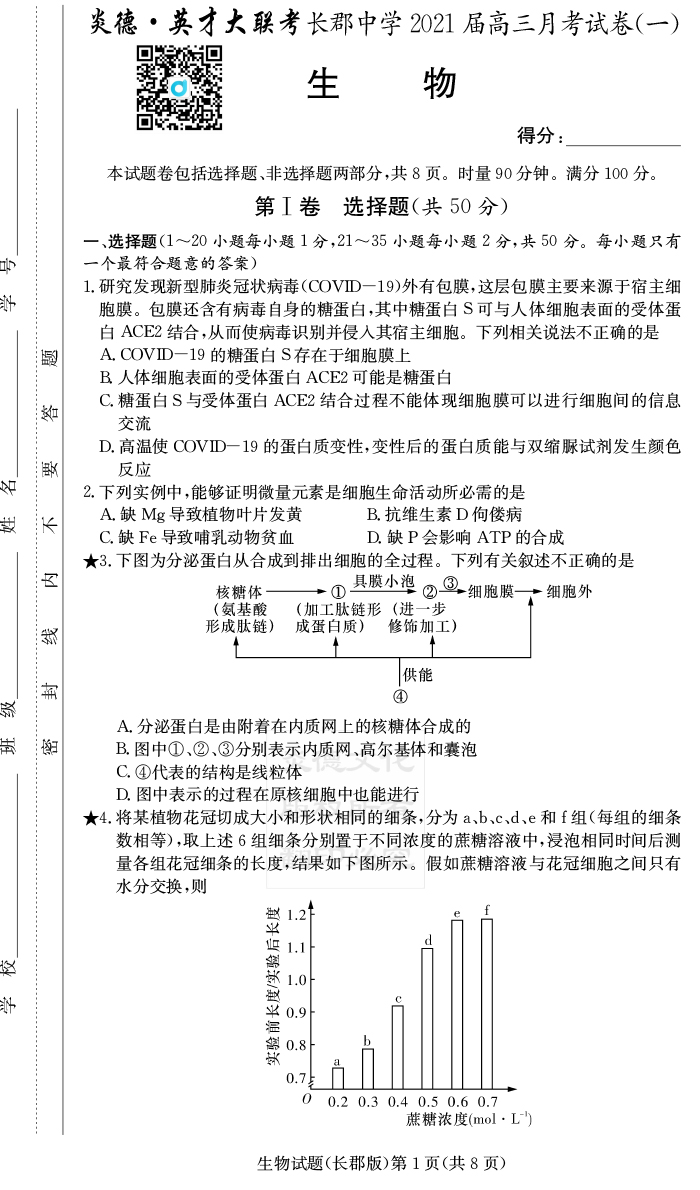 【生物】炎德英才大聯(lián)考2021屆長郡中學(xué)高三1次月考