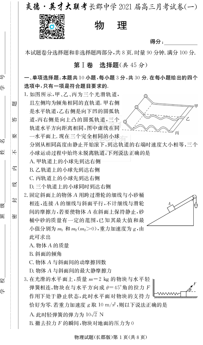 【物理】炎德英才大聯(lián)考2021屆長郡中學(xué)高三1次月考