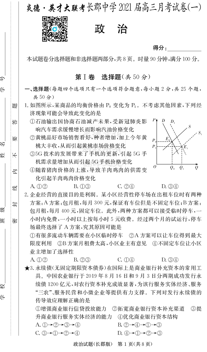 【政治】炎德英才大聯(lián)考2021屆長郡中學(xué)高三1次月考