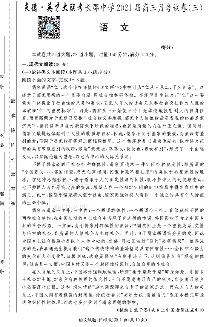 【語文】炎德英才大聯(lián)考2021屆長郡中學(xué)高三3次月考