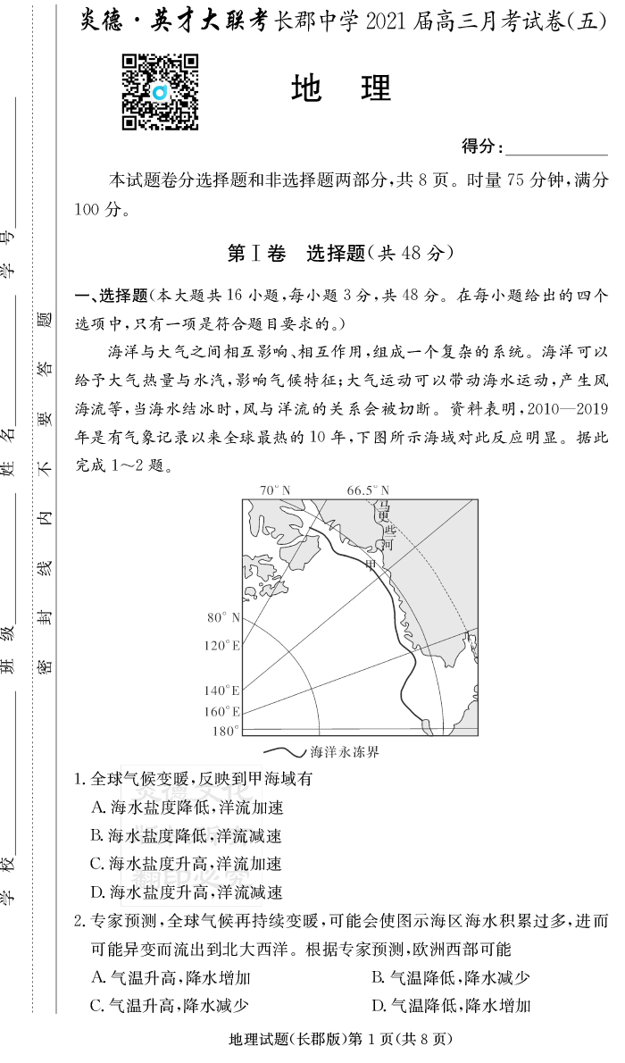 【地理】炎德英才大聯(lián)考2021屆長(zhǎng)郡中學(xué)高三5次月考