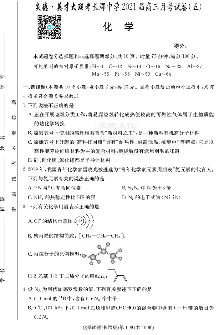【化學(xué)】炎德英才大聯(lián)考2021屆長(zhǎng)郡中學(xué)高三5次月考