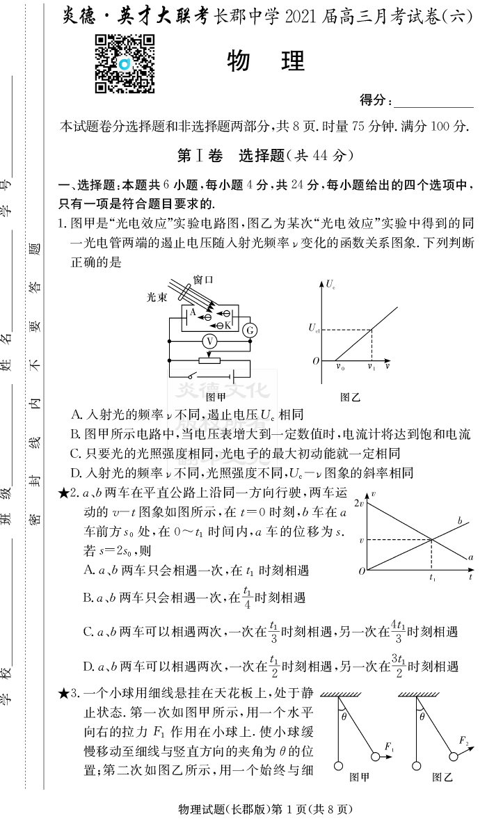 【物理】炎德英才大聯(lián)考2021屆長(zhǎng)郡中學(xué)高三6次月考