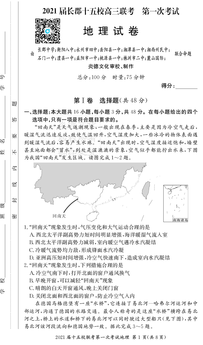 【地理】炎德英才大聯(lián)考2021屆長郡中學(xué)高三7次月考(十五校聯(lián)考一)