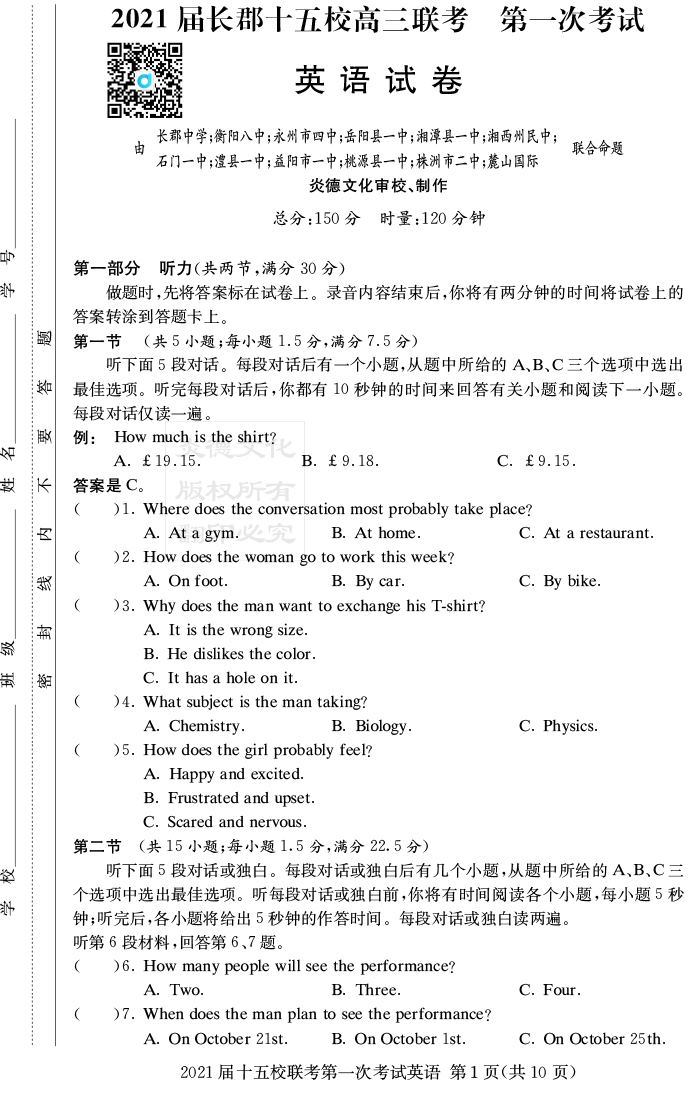 【英語】炎德英才大聯(lián)考2021屆長郡中學(xué)高三7次月考(十五校聯(lián)考一)