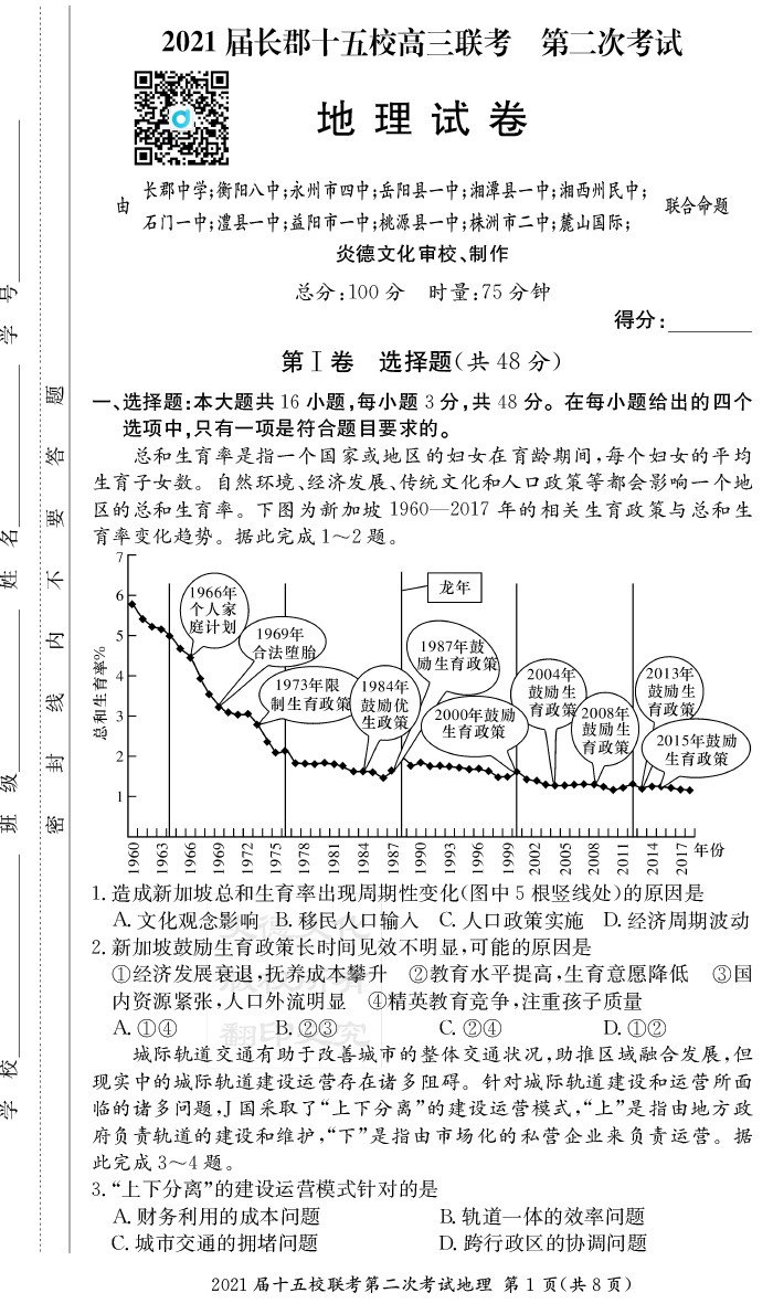 【地理】炎德英才大聯(lián)考2021屆長郡中學(xué)高三8次月考(十五校聯(lián)考二)