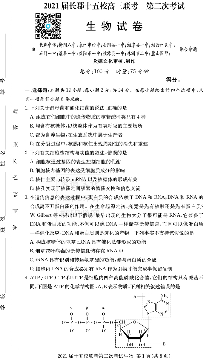 【生物】炎德英才大聯考2021屆長郡中學高三8次月考(十五校聯考二)