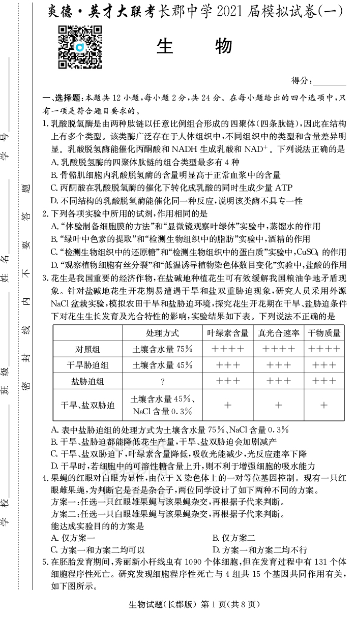 【生物】炎德英才大聯考2021屆長郡中學高三9次月考(模擬一)