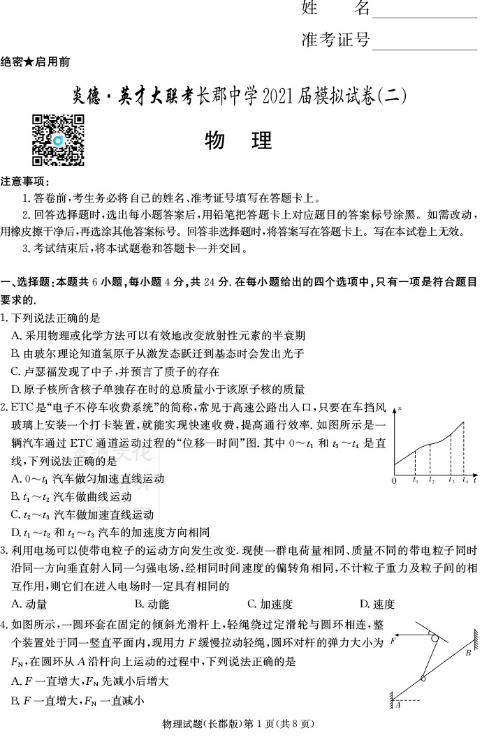 【物理】炎德英才大聯(lián)考2021屆長(zhǎng)郡中學(xué)高三10次月考(模擬二)