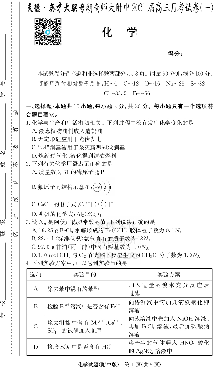 【化學(xué)】炎德英才大聯(lián)考2021屆湖南師大附中高三1次月考