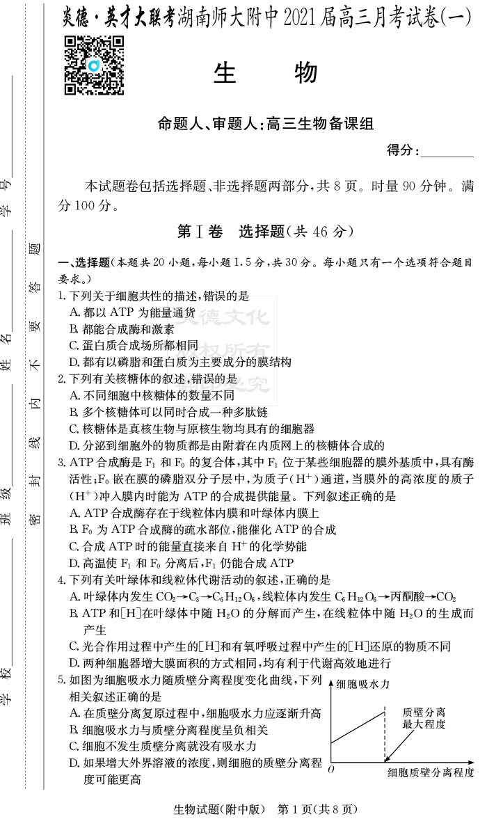 【生物】炎德英才大聯(lián)考2021屆湖南師大附中高三1次月考