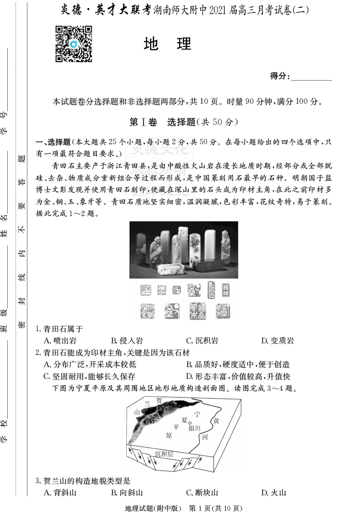 【地理】炎德英才大聯(lián)考2021屆湖南師大附中高三2次月考