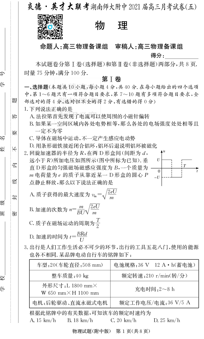 【物理】炎德英才大聯(lián)考2021屆湖南師大附中高三5次月考