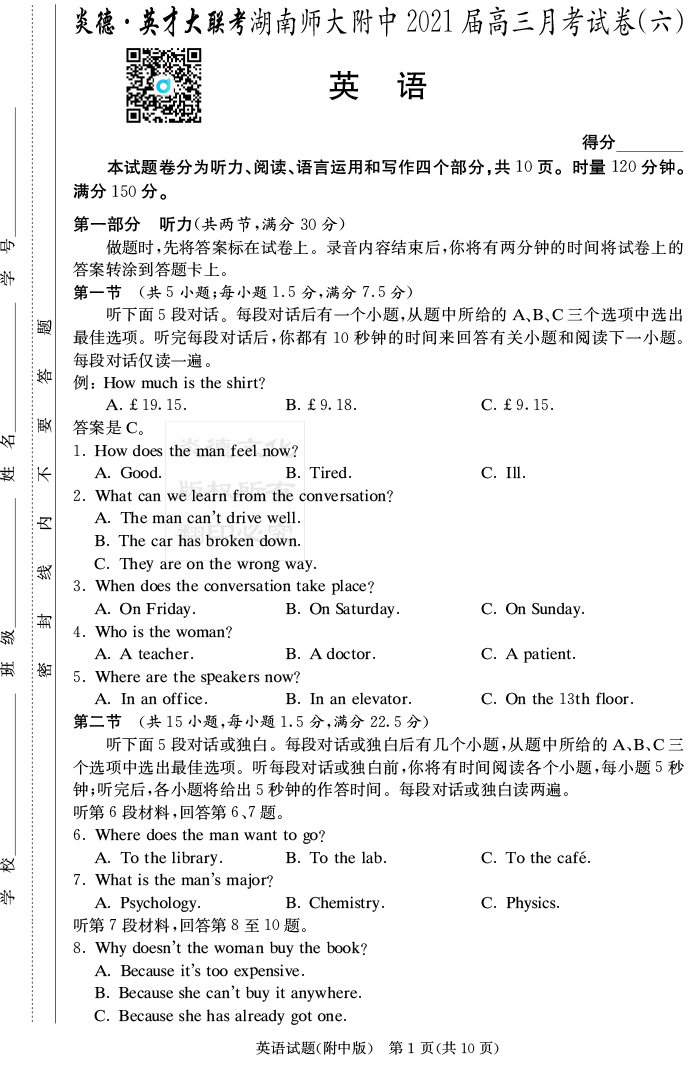 【英語】炎德英才大聯(lián)考2021屆湖南師大附中高三6次月考