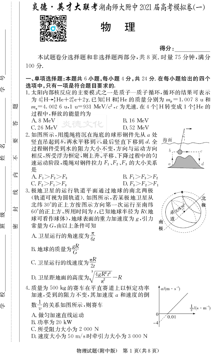 【物理】炎德英才大聯(lián)考2021屆湖南師大附中高三8次月考(模擬一)