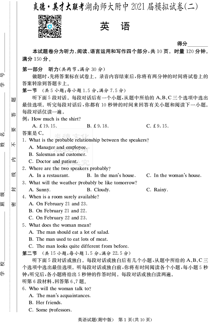 【英語】炎德英才大聯(lián)考2021屆湖南師大附中高三9次月考(模擬二)