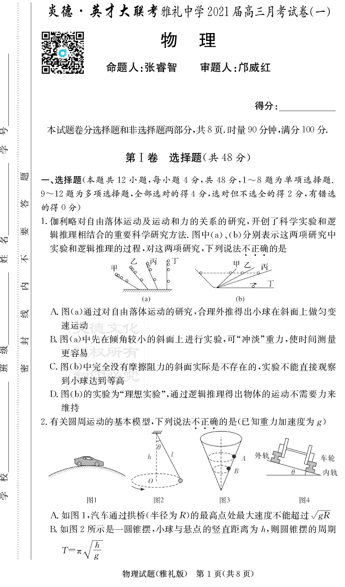 【物理】炎德英才大聯(lián)考2021屆雅禮中學(xué)高三1次月考